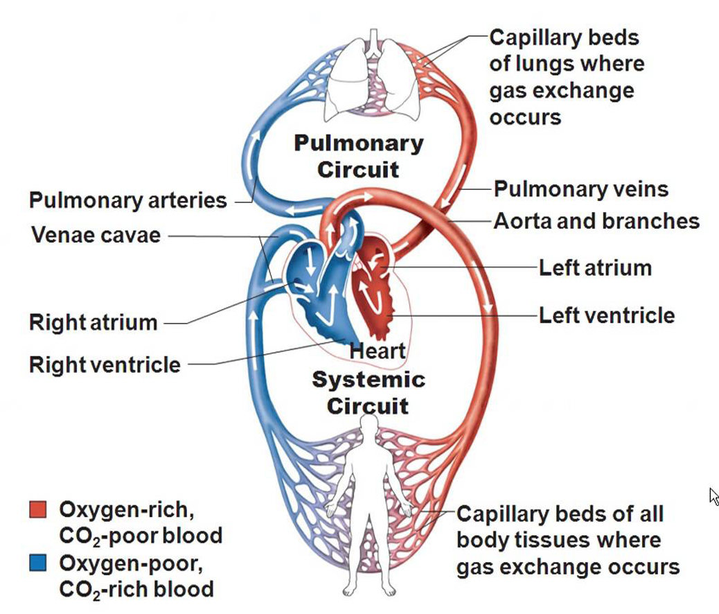 The cardiovascular system consists of the heart and blood vessels (arteries, veins, and capillaries). It delivers oxygen and nutrients to the tissues and carries waste products to the organs responsible for elimination. The cardiovascular system transports blood to almost all of the body's tissues. The blood delivers essential nutrients and oxygen and removes wastes and carbon dioxide to be processed or removed from the body. Hormones are transported throughout the body via the blood's liquid plasma.